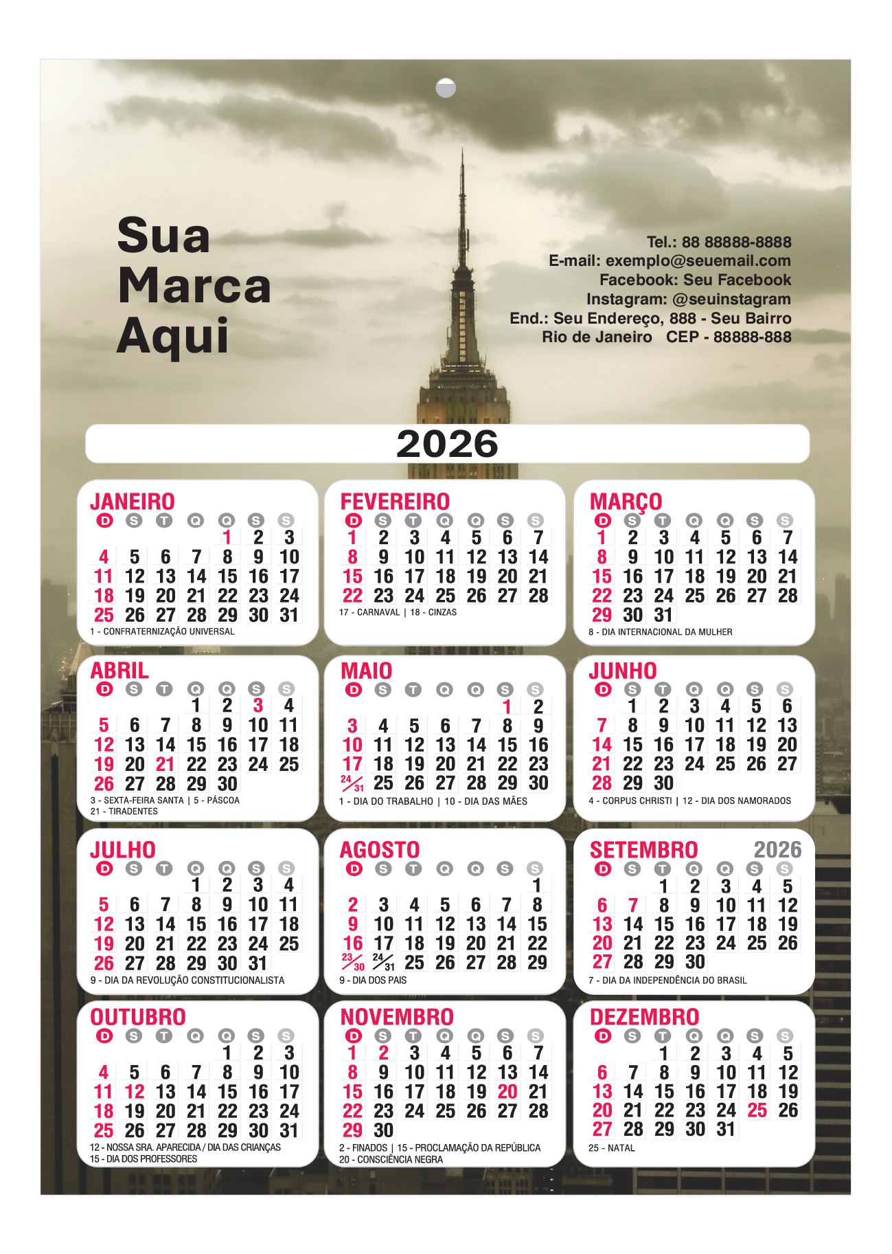 Produzido em papel Offset 240 g de ótima resistência e com impressão pigmentada de alta qualidade, garante cores vivas e durabilidade durante todo o ano.